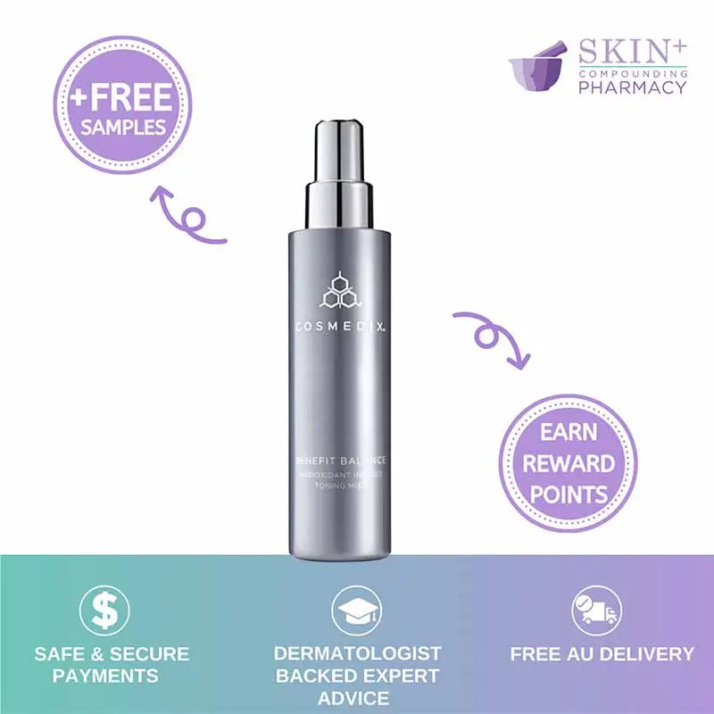 >1%: Hamamelis Virginiana (Witch Hazel) Water, Water, Glycerin, Polysorbate 20 <1%: Cassia Angustifolia Seed Polysaccharide, Chamomilla Recutita (Matricaria) Flower Extract, Camellia Sinensis (Green Tea) Leaf Extract, Aloe Barbadensis Leaf Juice, Butyrospermum Parkii (Shea) Butter, Citrus Paradisi (Grapefruit) Peel Oil, Santalum Album (Sandalwood) Oil, Lactic Acid (L), Glucuronic Acid (D), Allantoin, Menthol (L), Glutathione (L), Ethylhexylglycerin, Phenoxyethanol Brand Cosmedix