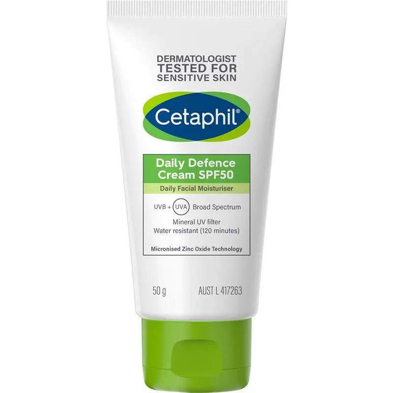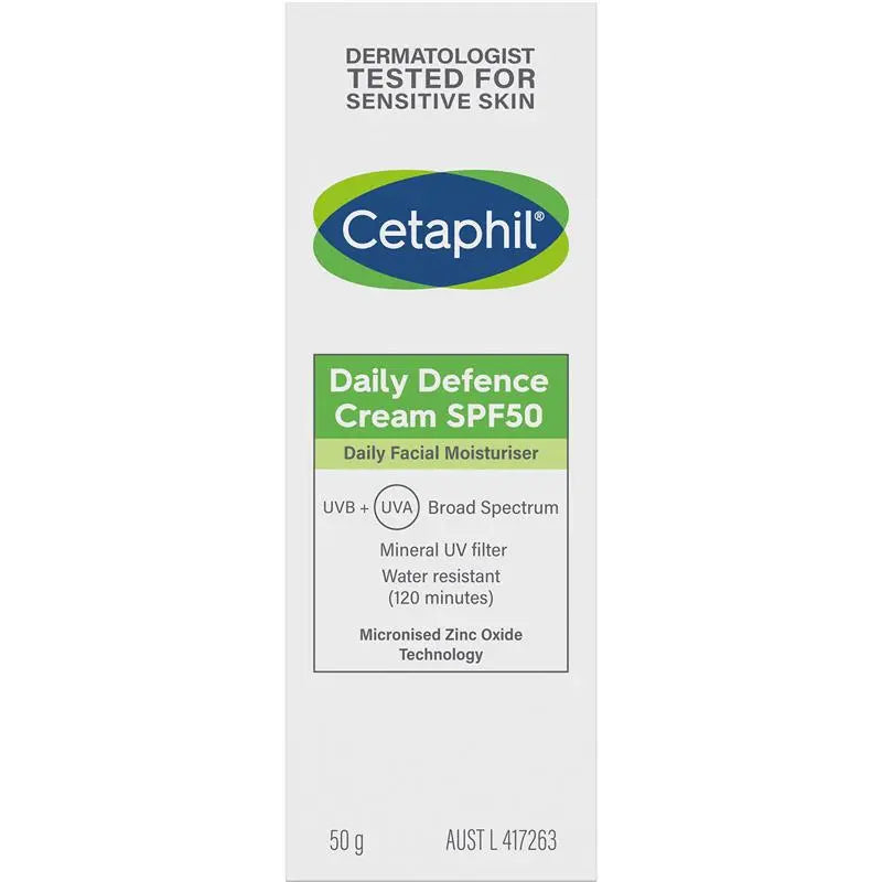 Cetaphil® Daily Defence Cream SPF 50 is a daily use SPF 50 cream with a mineral UV filter. Formulated with micronised zinc oxide technology, this mineral sunscreen provides broad spectrum UVB + UVA protection with 120 minutes of water resistance to help prevent premature skin aging due to sun exposure. The formula contains no added fragrance and is dermatologist tested for sensitive skin.rays/sunburn & helps prevent skin aging due to sun exposure.