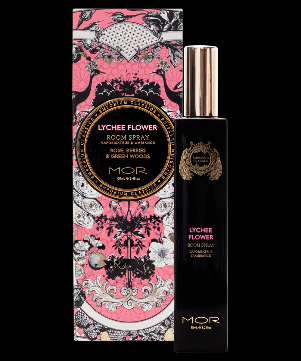 A signature Lychee Flower fragranced Room Spray presented in an elegant black glass bottle to add instant aroma and ambiance to any space.